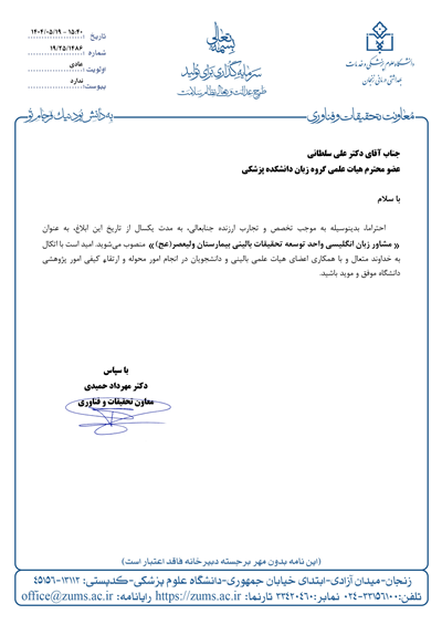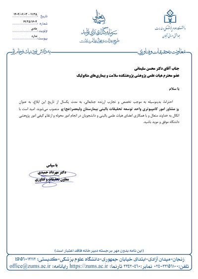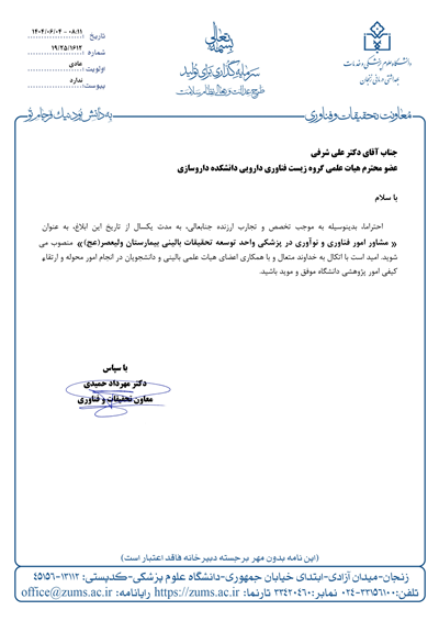 ابلاغ مشاور امور فناوری و نوآوری  در پزشکی